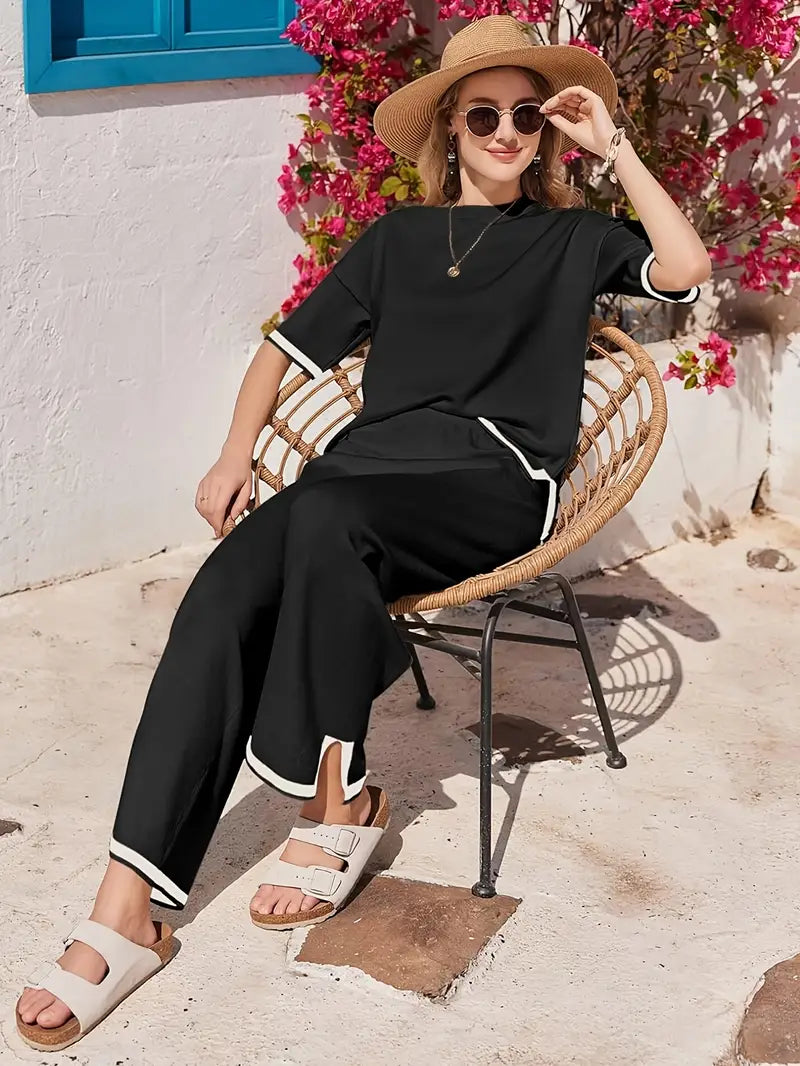 Dieses stilvolle Zweiteiler Set vereint lässige Eleganz mit funktionalem Design, ideal für entspannte Tage, an denen Komfort genauso zählt wie Ausstrahlung. Das anschmiegsame Stretchgewebe sorgt für ein angenehmes Tragegefühl, während der lockere Schnitt Bewegungsfreiheit garantiert. Die klare Linienführung und das durchdachte Design machen es zum perfekten Alltagsbegleiter mit modischem Anspruch.