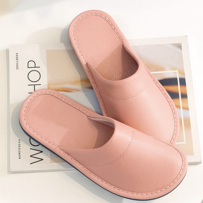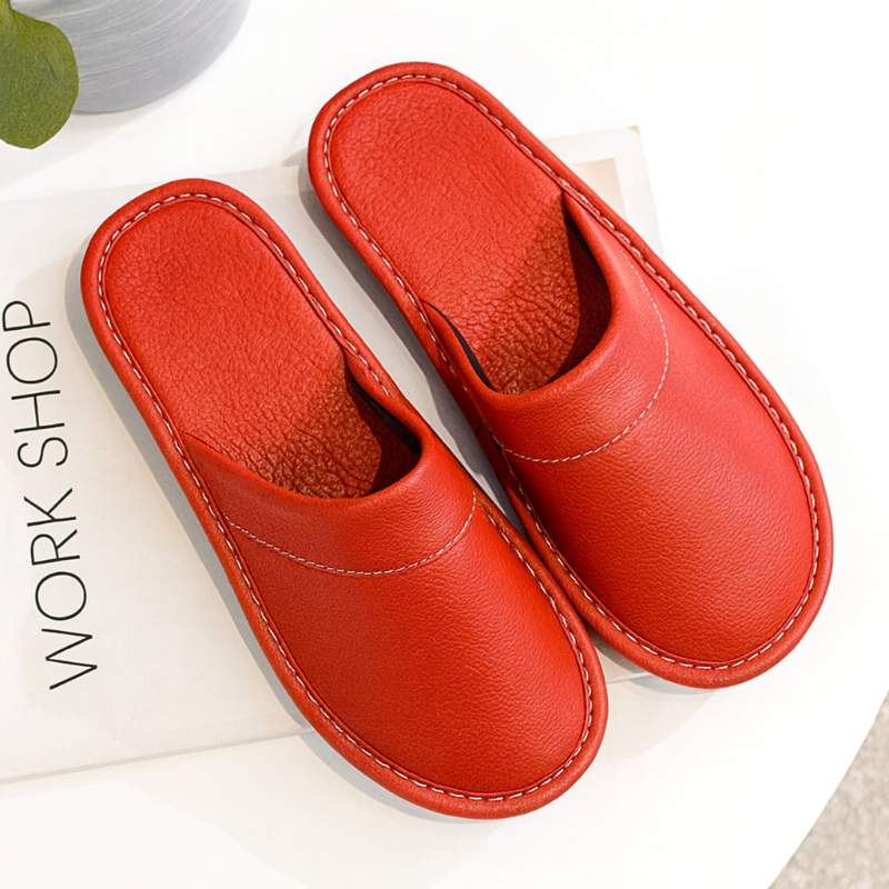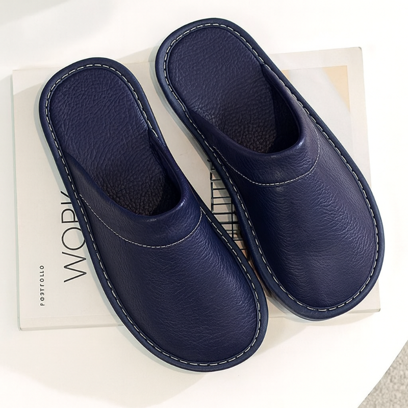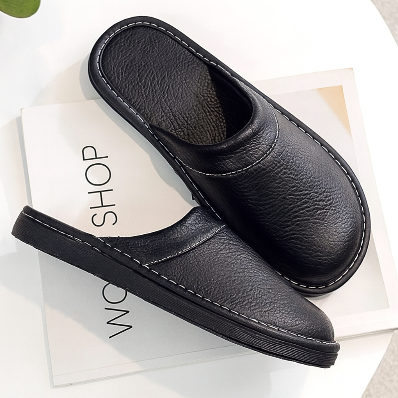 Diese Herrenhausschuhe verfügen über ein geschlossenes Slip-on-Design mit strukturierter Oberfläche und kontrastierenden Ziernähten entlang der Kanten. Die robuste Sohle sorgt für sicheren Halt im Innenbereich, während der niedrige Fersenbereich ein einfaches An- und Ausziehen ermöglicht. Ideal für den täglichen Gebrauch zu Hause.