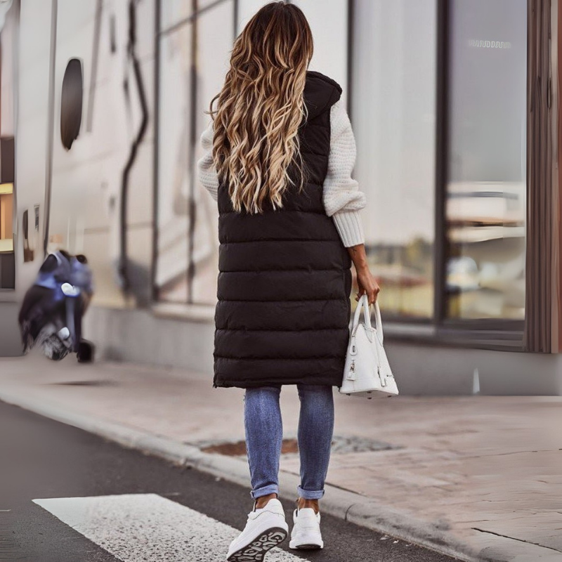 Diese knielange Steppweste für Damen bietet funktionale Wärme und eignet sich zum Tragen über Pullover oder Langarmshirts. Sie ist für kühle Tage in Herbst und Winter konzipiert und ergänzt Alltagsbekleidung um eine zusätzliche Lage.