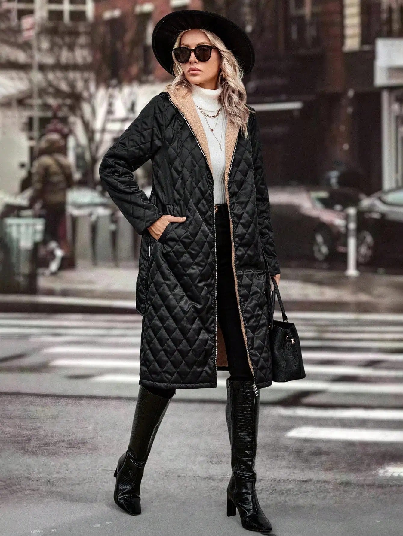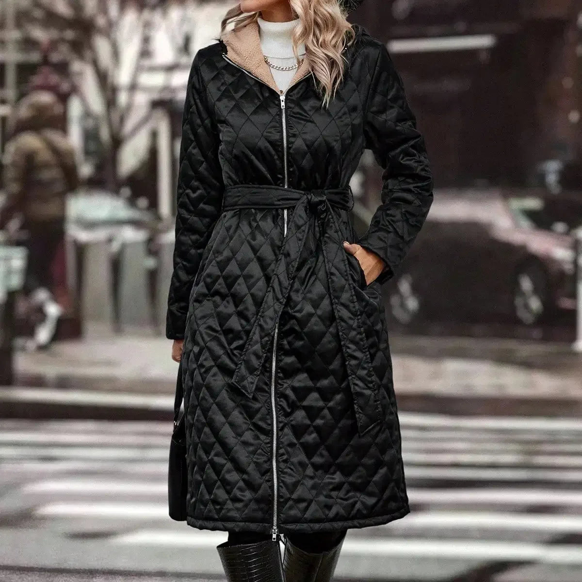 Erleben Sie Eleganz und Funktionalität mit dem Alina® | Gestepper Kapuzenmantel, der ideal für kalte Tage in der Stadt ist.