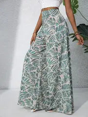 Gleite durch warme Tage mit Sofia – leichten, taillenhohen Hosen, die Boho‑Flair mit alltäglicher Eleganz vereinen. Die fließenden, weiten Beine und der tropische Blätterprint schaffen ein modisches Statement, das du vom Strandspaziergang bis zum Abendessen im Sonnenuntergang lieben wirst.