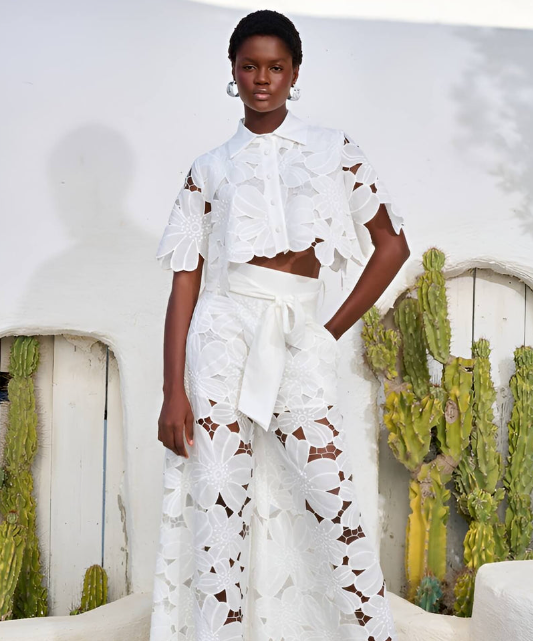 Dieses exquisite zweiteilige Ensemble besteht aus einem zarten Hemd mit Spitzenbesatz und einer Hose mit weitem Bein, die perfekt für jeden Anlass geeignet ist. Die subtilen floralen Akzente verleihen ihm einen Hauch von Romantik und machen es zu einer vielseitigen Wahl vom Brunch bis zur Abendveranstaltung.