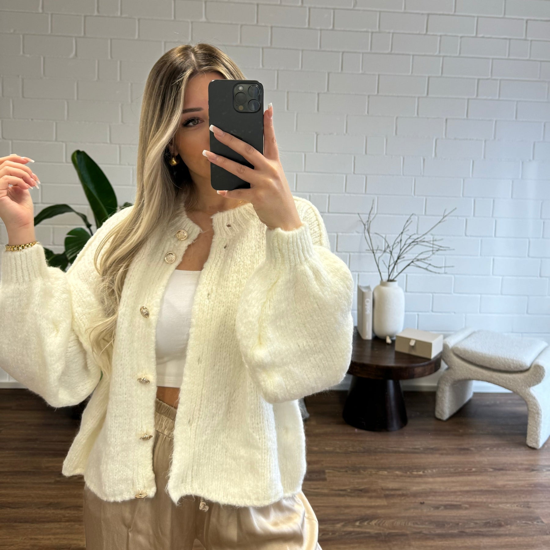 Elegante goldene Knopfdetails: Die zarten goldenen Knöpfe verleihen einen Hauch von Weiblichkeit und Raffinesse und machen die Chiara-Strickjacke zu einem beliebten Lieblingsstück. Diese Akzente verleihen Ihrem Look einen subtilen Hauch von Luxus und machen sie zu einem Must-have für den Übergang zwischen den Jahreszeiten.