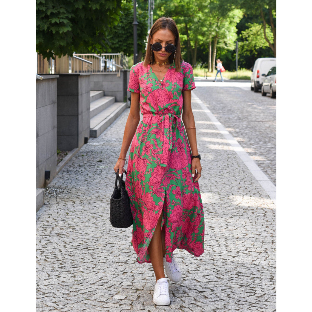 Dieses Damen Wickelkleid mit Midilänge und Blumendruck setzt auf eine verstellbare Silhouette für mehr Tragefreiheit. Das Wickeldesign passt sich flexibel an, während die mittlere Länge und klare Linienführung den Look ausgleichen. Geeignet für Alltag, Ausflüge oder spontane Anlässe – tragbar mit Leichtigkeit.