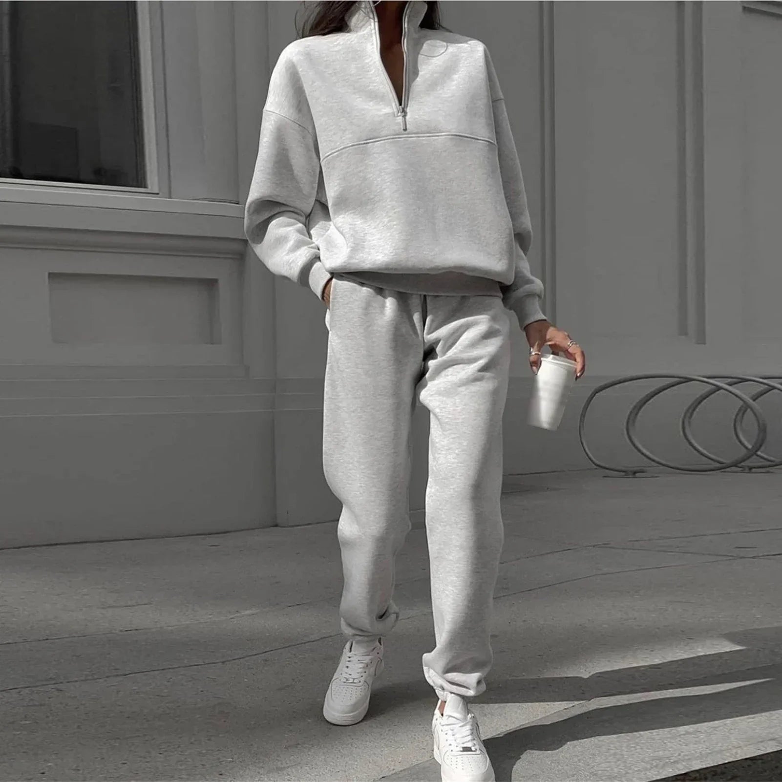 Werten Sie Ihre Loungewear mit diesem elegant gefertigten Sweatsuit mit Reißverschluss auf, der modernen Minimalismus mit raffiniertem Komfort verbindet. Er ist aus Plüsch gefertigt und hat eine taillierte Silhouette, die dafür sorgt, dass Sie auch in entspannten Situationen elegant und raffiniert aussehen.