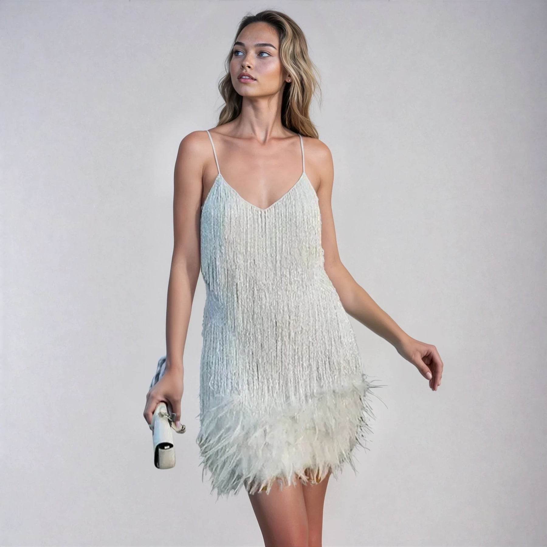 Erleben Sie glamouröse Auftritte mit unserem festlichen Federn-Minikleid – ein echter Eyecatcher, der Eleganz und Komfort verbindet. Das kurze Kleid besticht durch glitzernde Federn, lange Ärmel und einen stilvollen High-Neck mit Keyhole-Verschluss, der sofort Aufmerksamkeit erregt. Der abnehmbare Taillengürtel betont die Silhouette, während der halbtransparente Oberstoff mit feinem Innenfutter luxuriös umspielt – perfekt für Festlichkeiten, Cocktail-Partys oder besondere Anlässe.