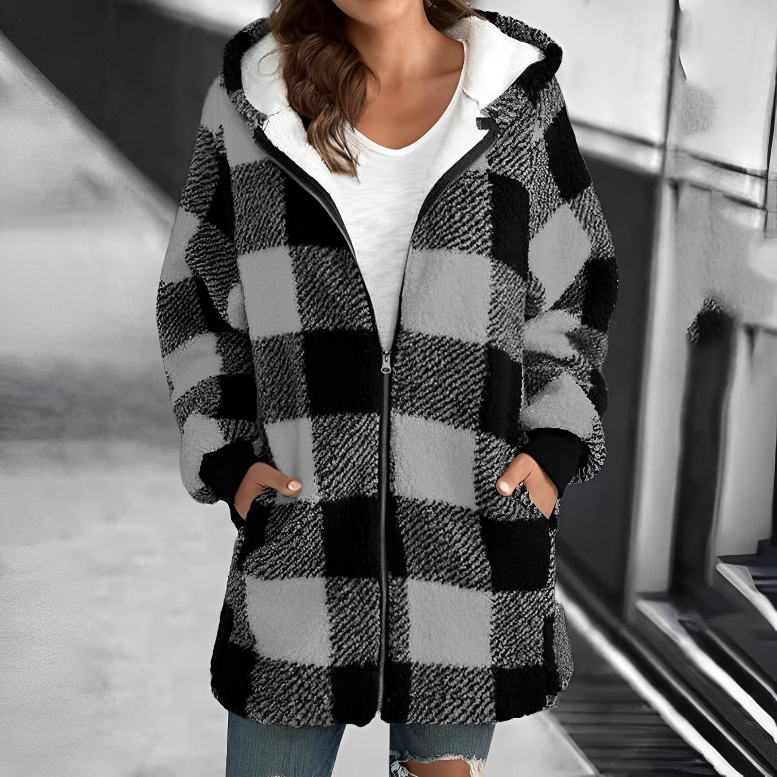 Mühelose Eleganz in einer karierten Kapuzenjacke mit Sherpa-Futter