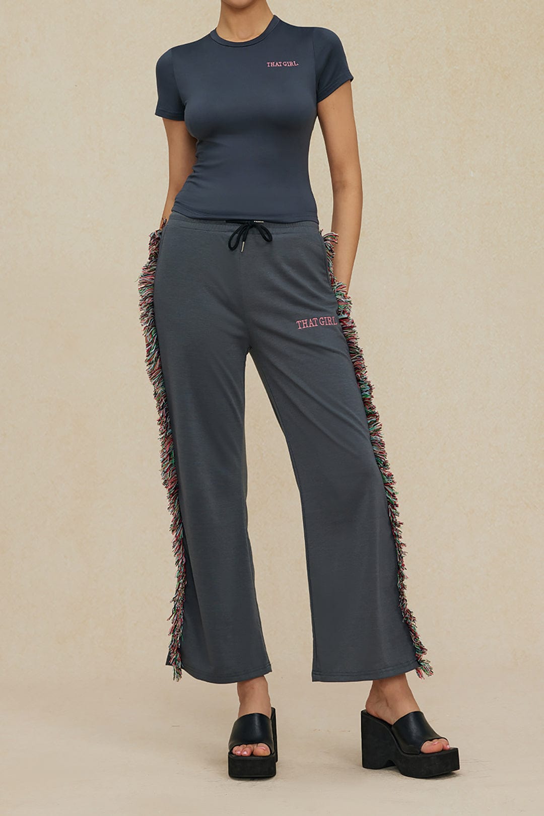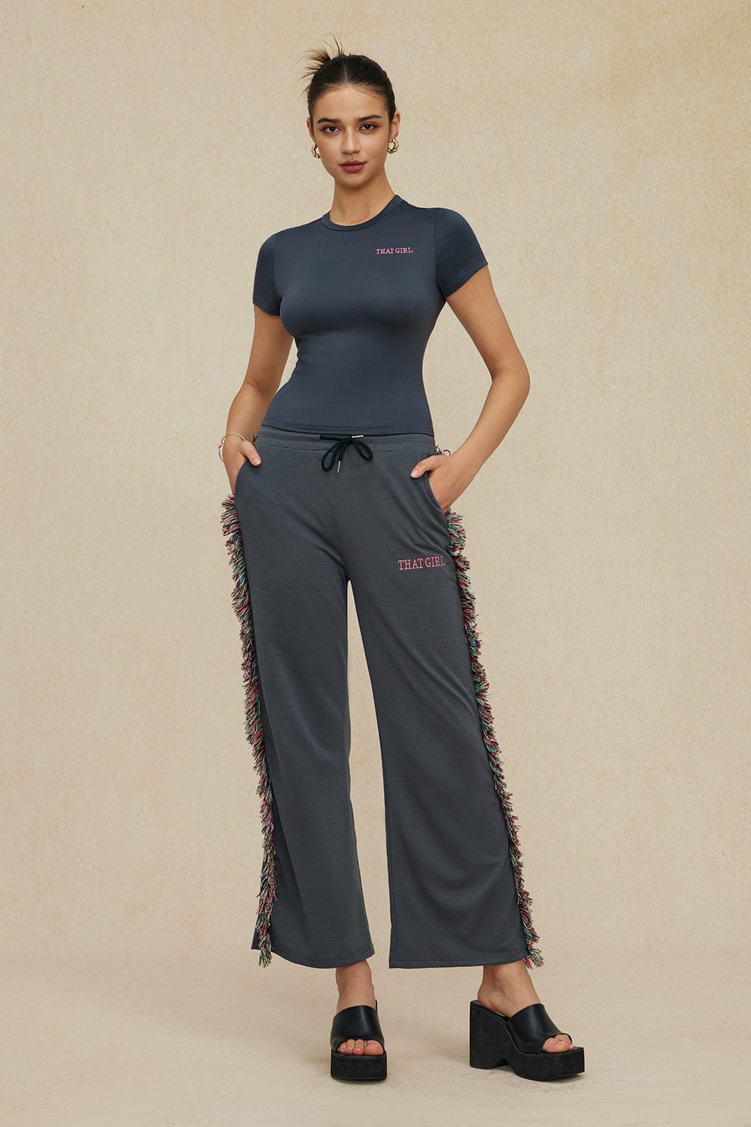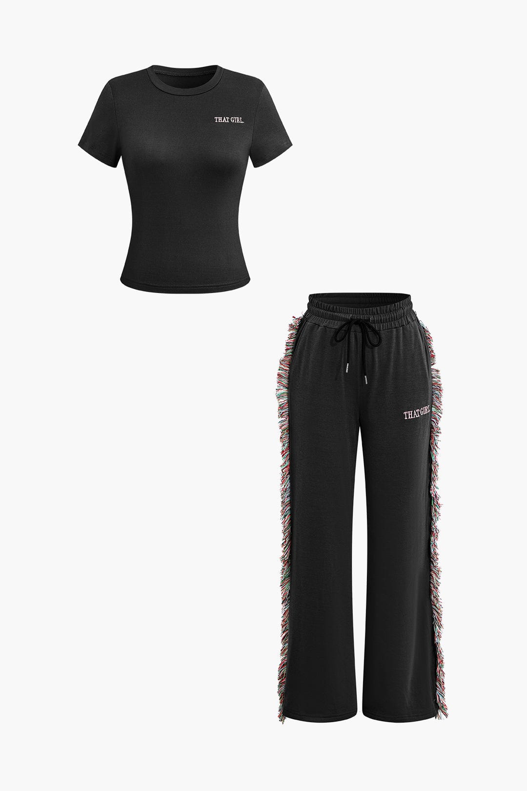Das Jade Freizeit-Set vereint sportliche Lässigkeit mit modischen Akzenten. Das enganliegende T-Shirt mit Rundhalsausschnitt bietet eine schmeichelhafte Passform, während die weit geschnittene Hose mit seitlichen Fransen für einen individuellen Look sorgt. Der elastische Bund mit Kordelzug garantiert optimalen Tragekomfort. Perfekt für trendige Streetstyle-Outfits oder gemütliche Tage zu Hause.