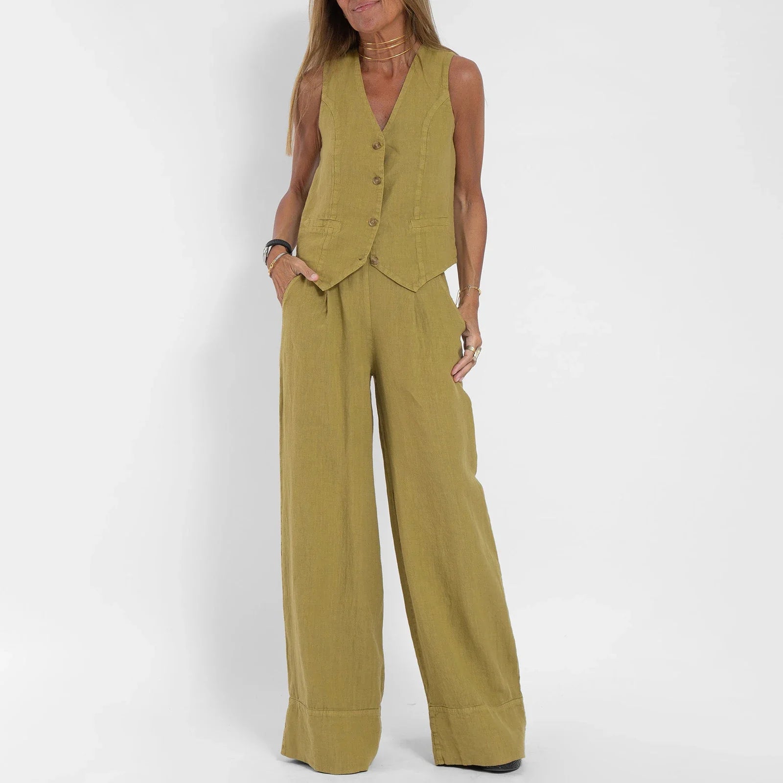 Peppen Sie Ihren Streetwear-Stil mit diesem modischen Julia Blazer Set auf. Das Set aus einer hochwertigen Baumwoll-Leinen-Mischung bietet einen bequemen und schicken Look, der perfekt für jeden lässigen Anlass ist. Der ärmellose Blazer verleiht einen maßgeschneiderten Touch, während die Hose mit weitem Bein für einen trendigen und entspannten Look sorgt.