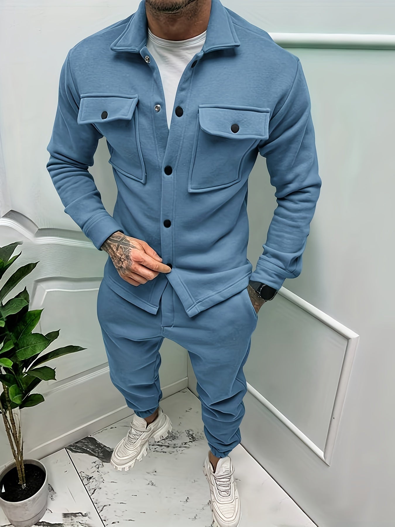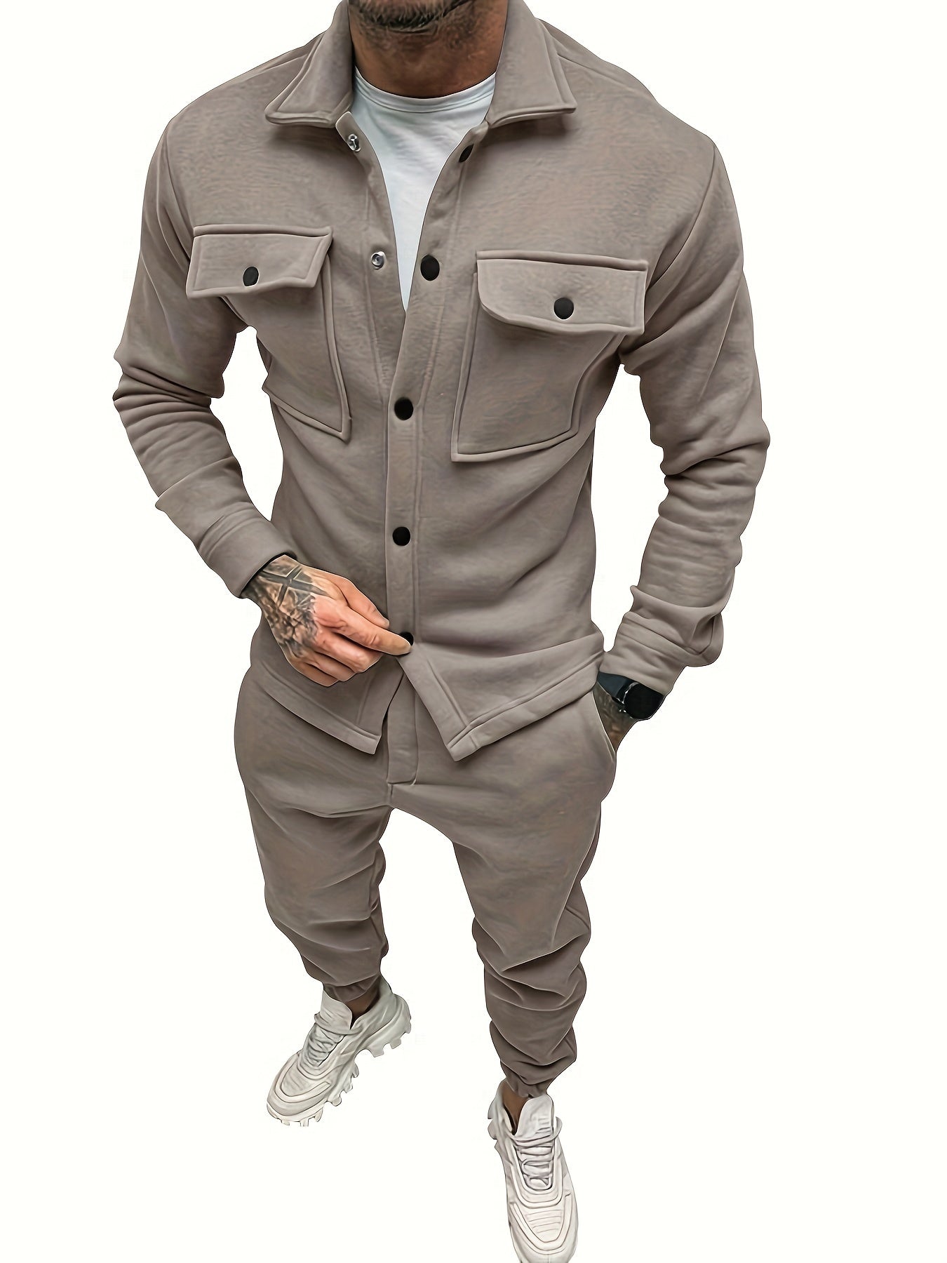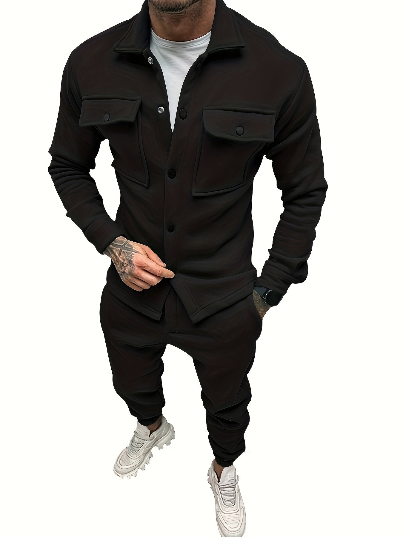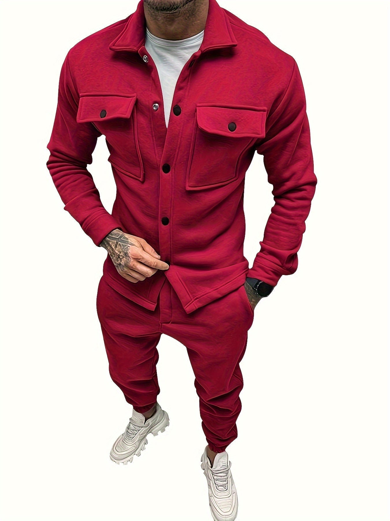 Lässiger Einfarbiger Baumwolle Trainingsanzug mit Knopfleiste, Hemd und Hose für Herren | Perfekt für Outdoor-Aktivitäten