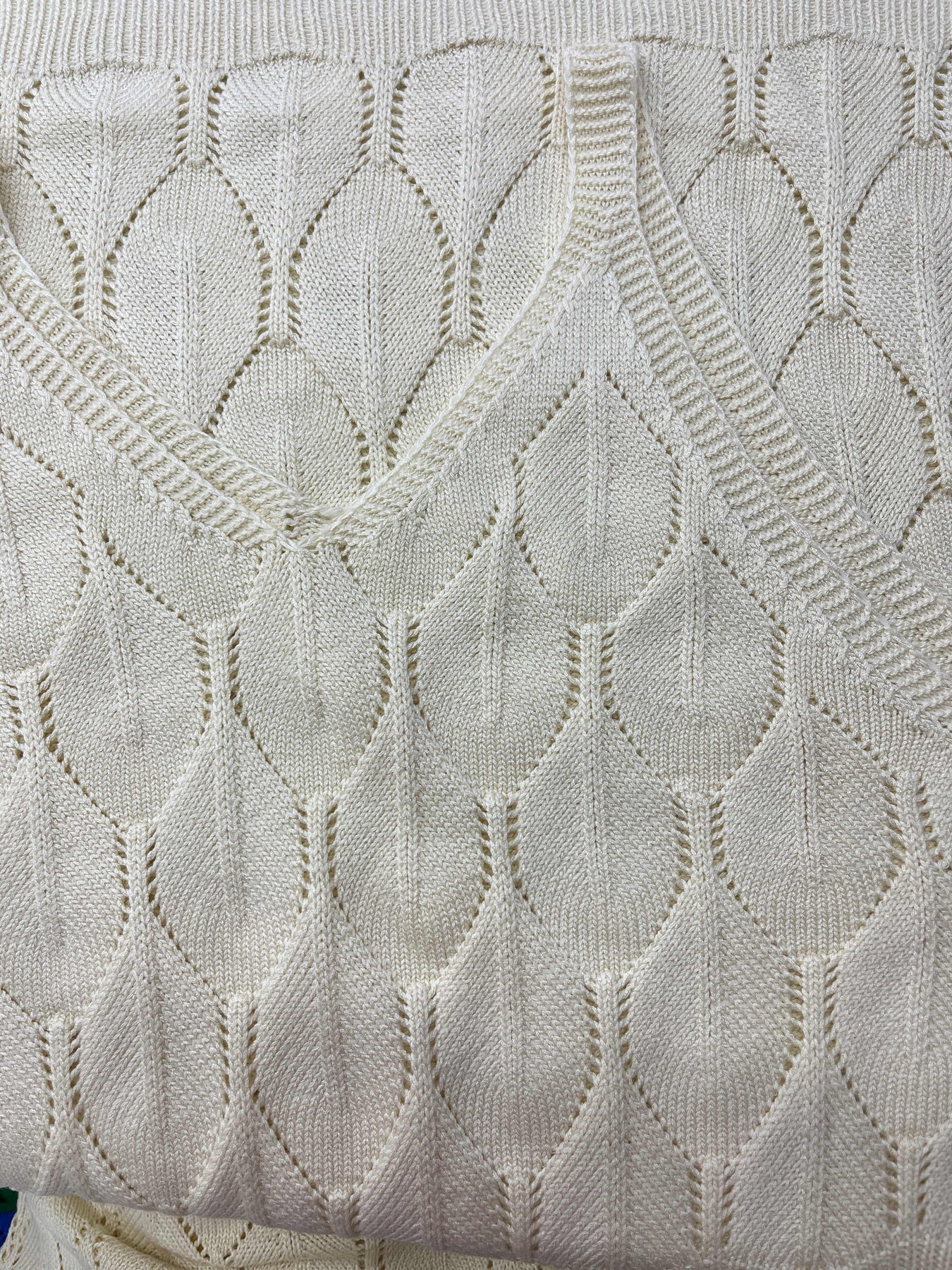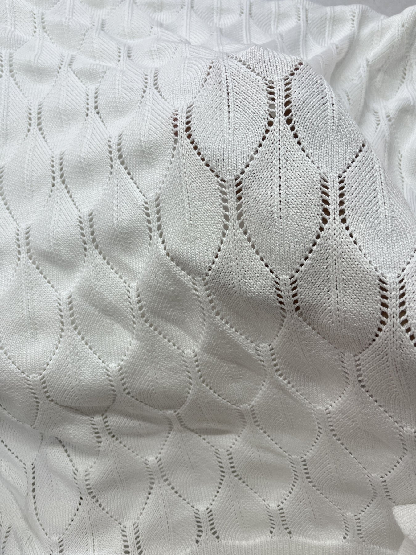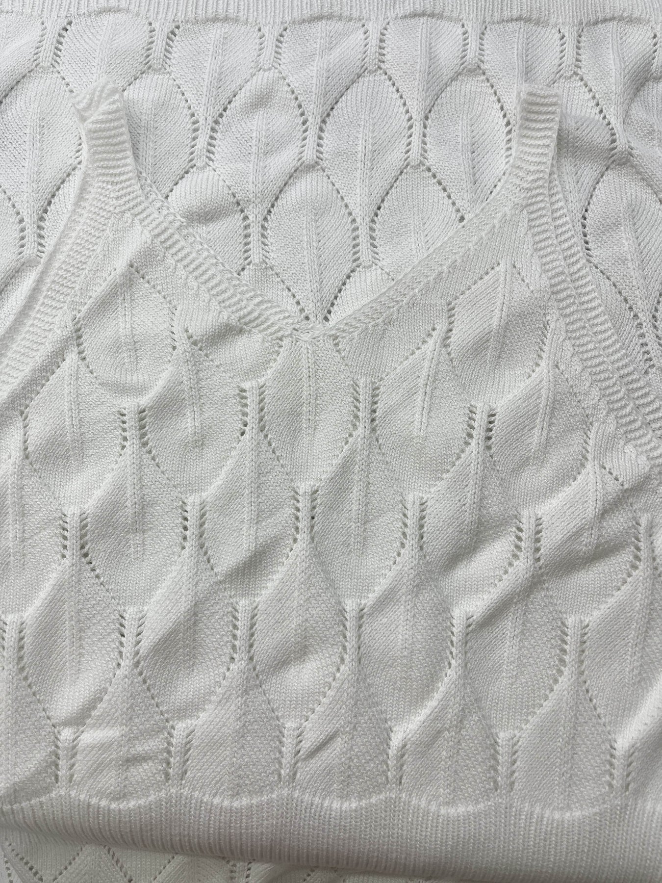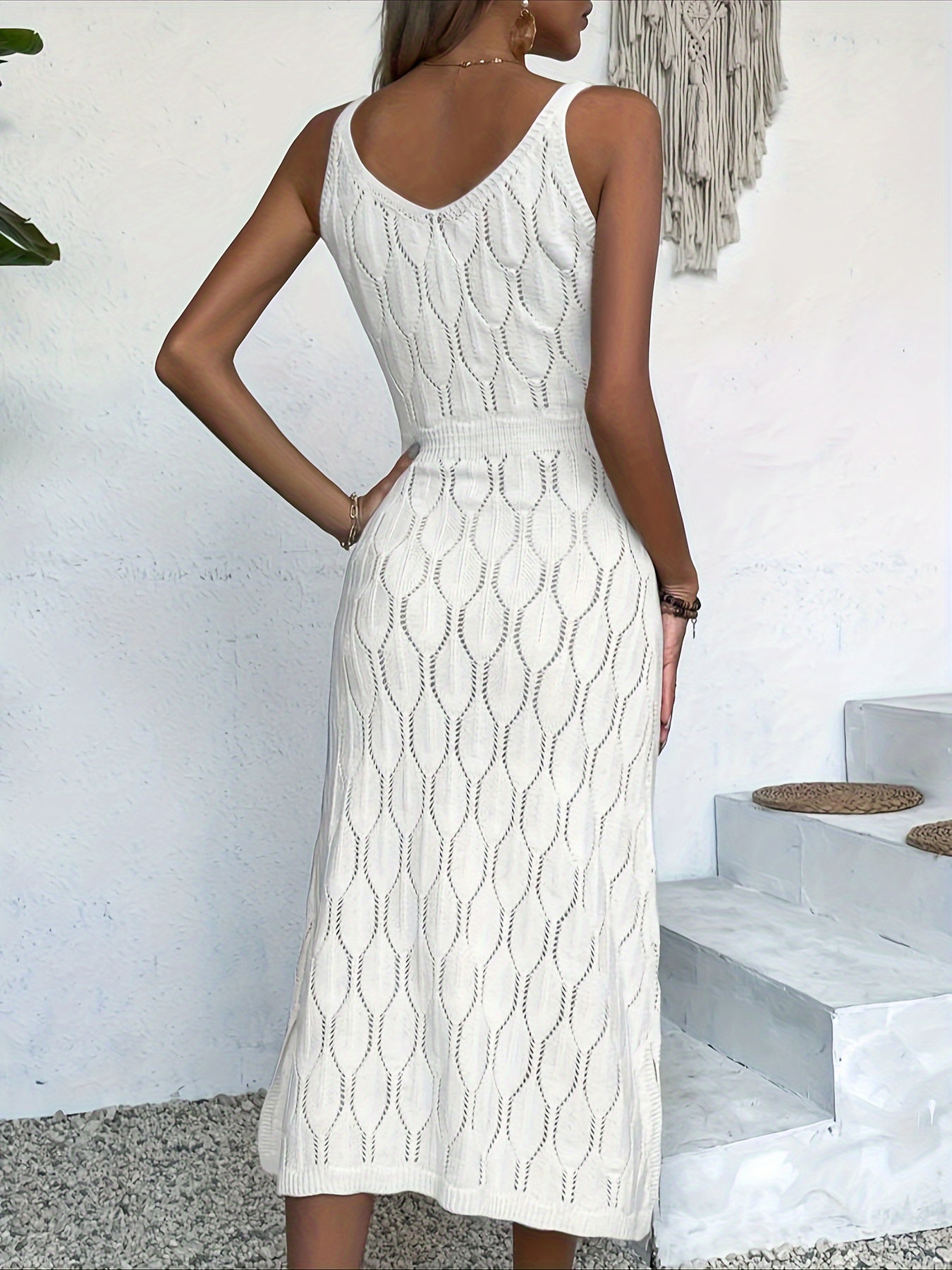 Aufwendige Strickstruktur mit durchbrochenen Details: Das Kleid besticht durch ein zartes, blattähnliches Strickmuster, das für einen interessanten Schau und Atmungsaktivität sorgt. Das auffällige Entwurf verleiht ihm einen handgemachten Charme und einen Hauch von Luxus. Es ist die perfekte Balance zwischen kuscheliger Textur und sommerlicher Luftigkeit.