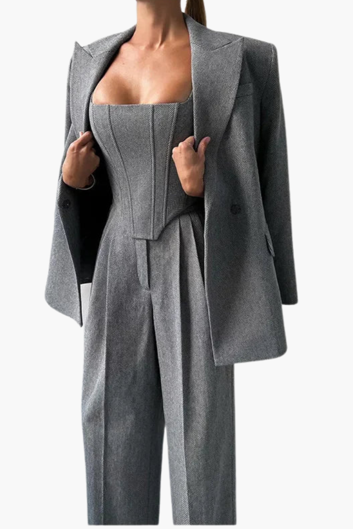 Unser beliebtes 3-teiliges Ensemble vereint Struktur, Raffinesse und kühne Weiblichkeit – entworfen, um einen bleibenden Eindruck in jedem Raum zu hinterlassen. Mit einem taillierten Blazer, einem konturierten Korsett und hochgeschnittenen Hosen bietet dieses meistverkaufte Power-Set unendliche Styling-Möglichkeiten und eine Silhouette, die Stärke und Anmut ausstrahlt.