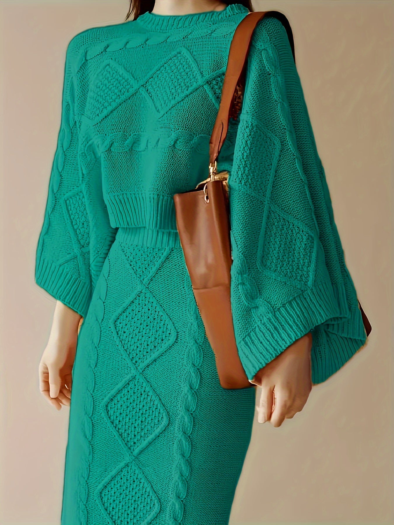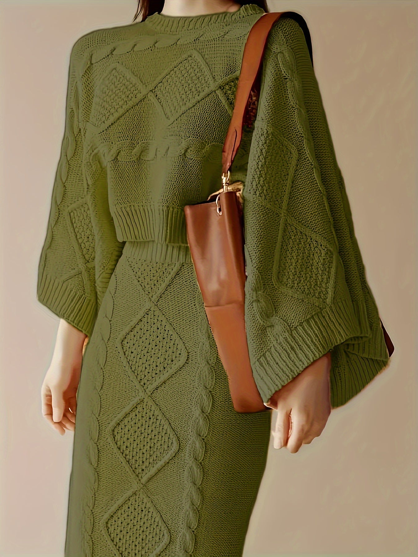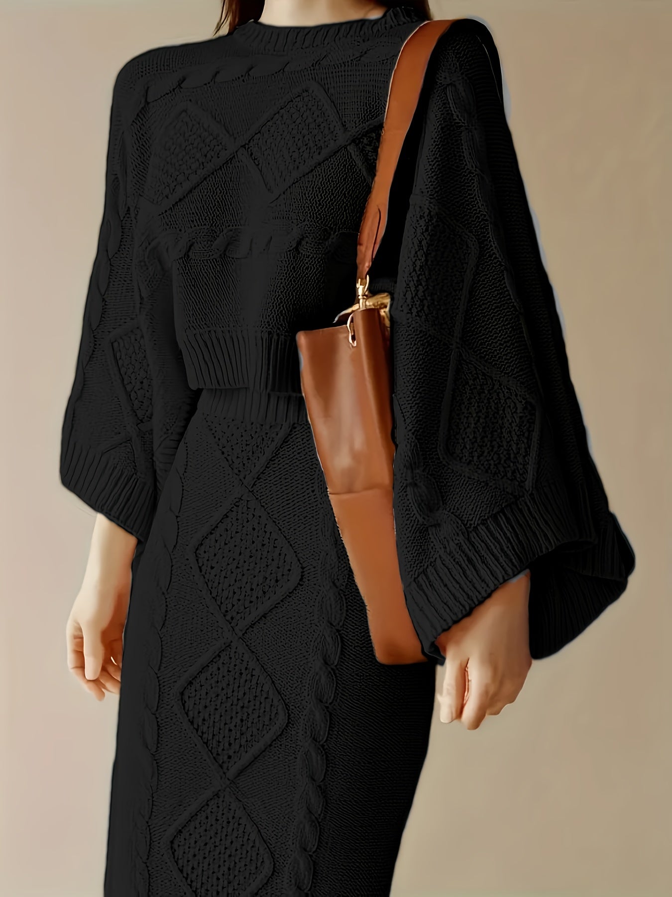 Stilvoller Pullover-Zweiteiler mit hohem Kragen, ausgestellten Ärmeln und Slim-Strickrock für Damen | Ideal für das tägliche Tragen