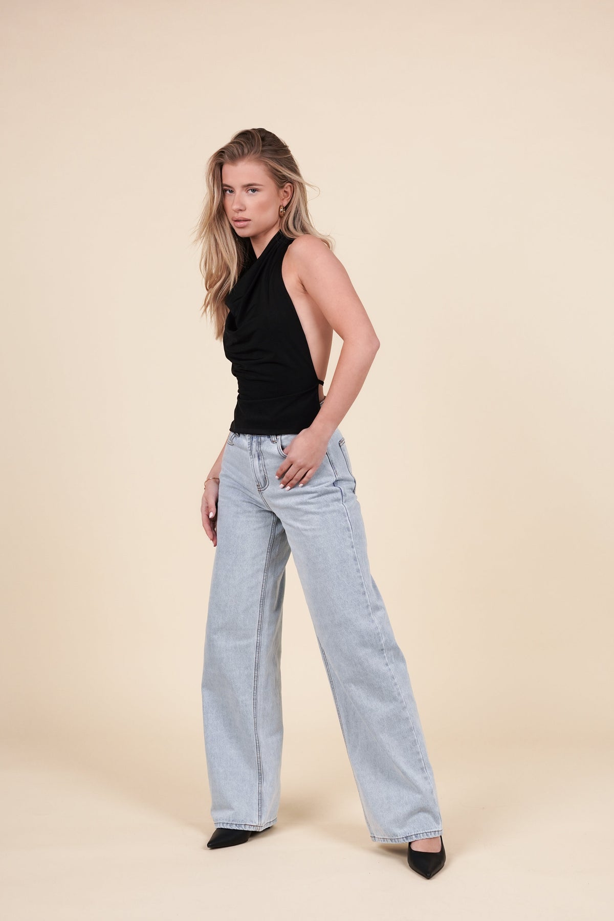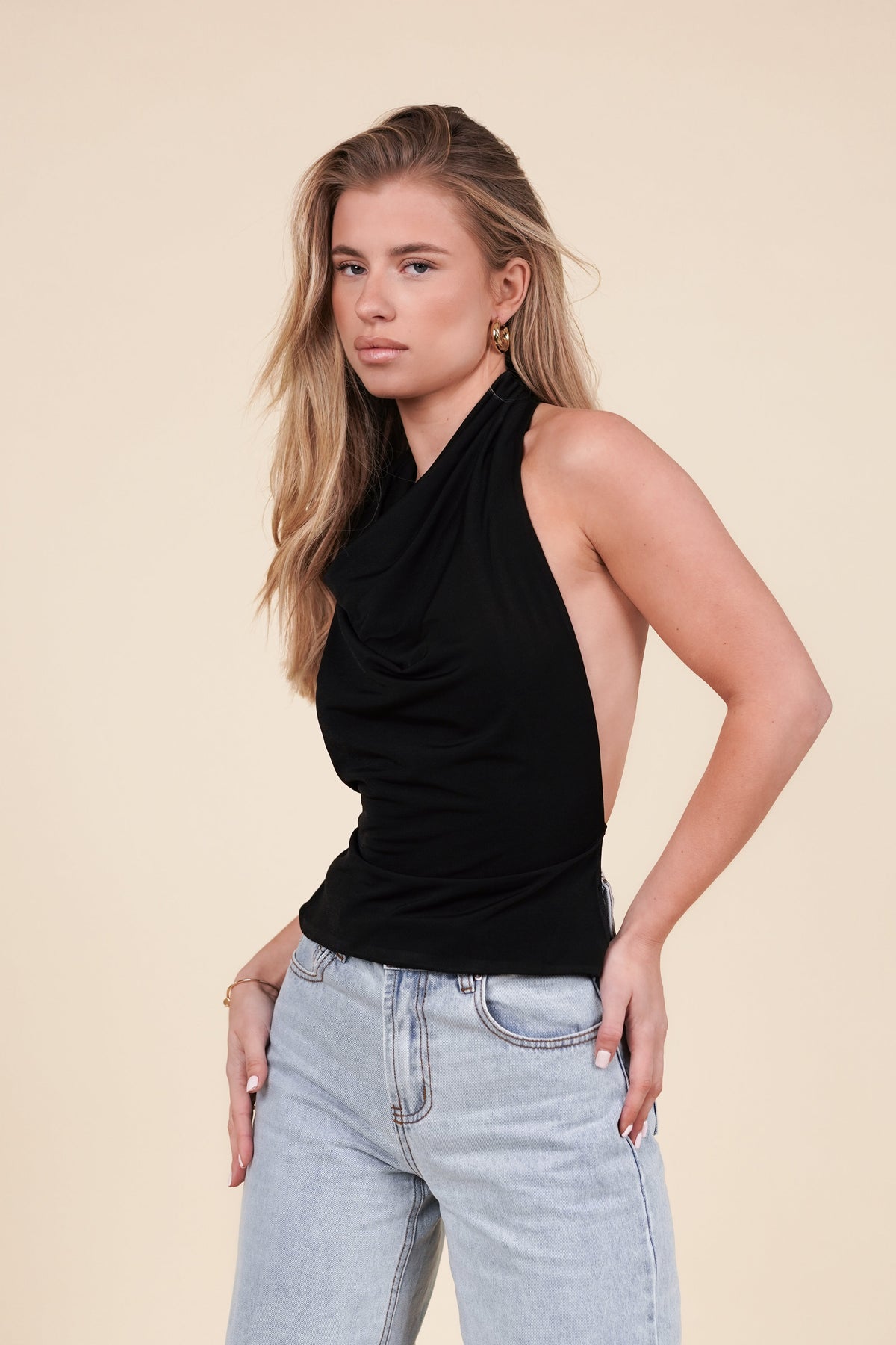 Das perfekte Oberteil für Ihre nächste Party. Das Neckholder-Top hat einen Wasserfall-Ausschnitt und wird am Hals mit einem goldenen Knopf geschlossen. Das Top hat einen schönen offenen Rücken, der am Rücken gebunden wird.
